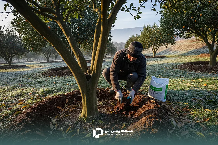 کوددهی پاییزه (پس از برداشت): بعد از برداشت محصول، مقدار ۵۰ تا ۷۰ کیلوگرم در هکتار به خاک اضافه کنید تا ذخایر غذایی درخت برای زمستانگذرانی و فصل رشد بعدی بازسازی شود.